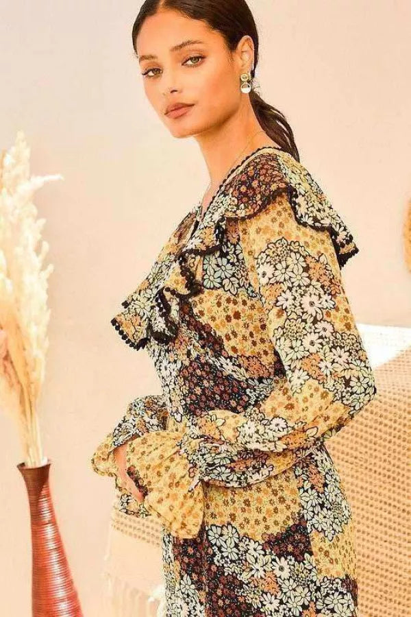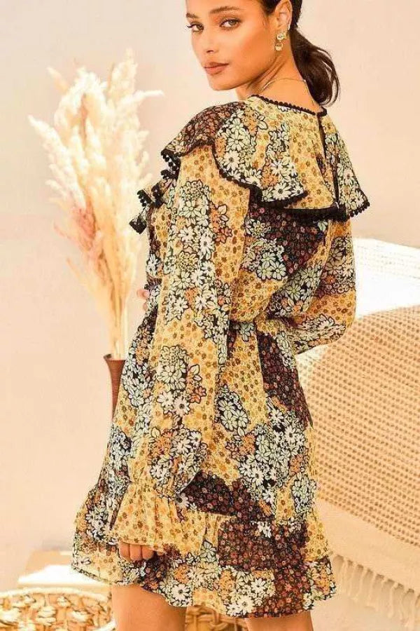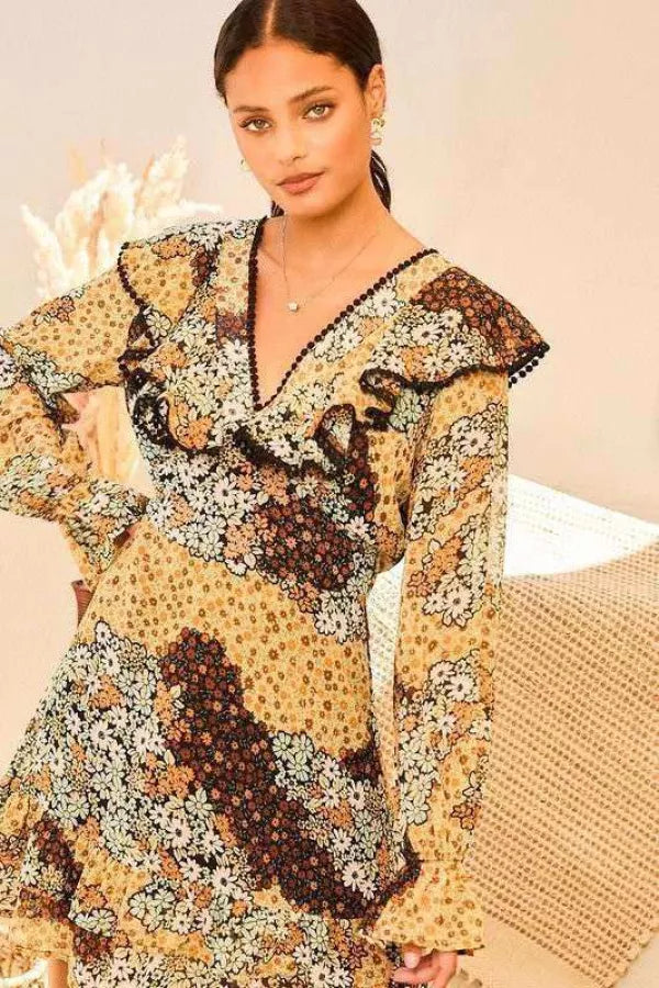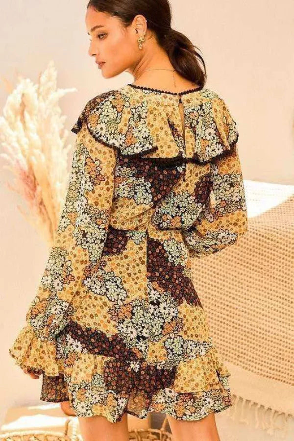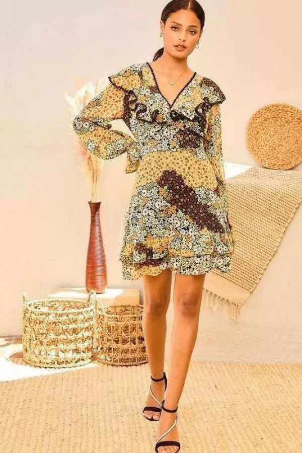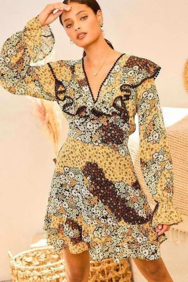 V Neck Ruffle Bubble Sleeve Multi Floral Dress